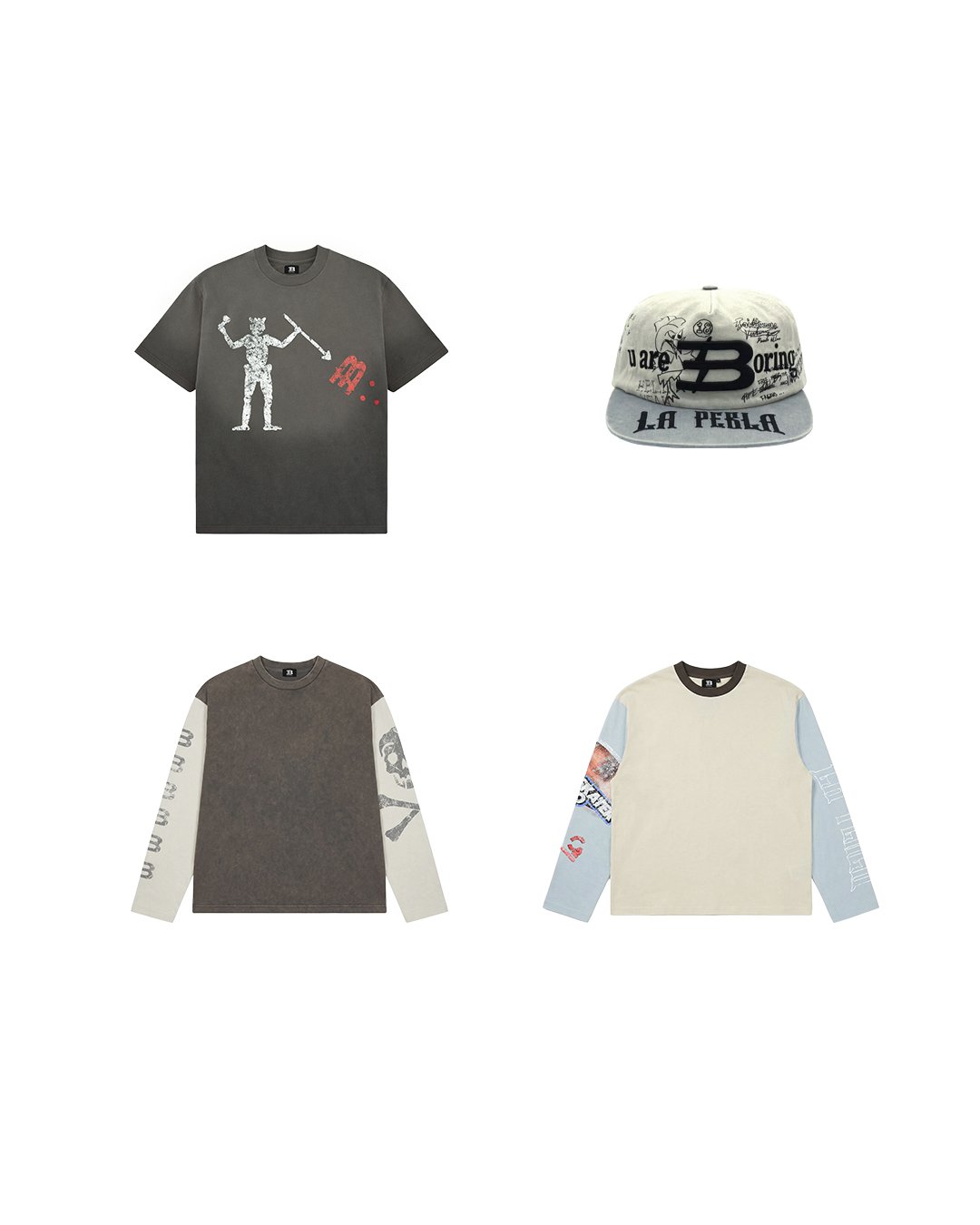 Con La Perla, Bogart traslada ese pasado al presente a través de códigos de la calle, el skate, el surf y la cultura juvenil. La colección busca recrear la sensación de encontrar un tesoro vintage olvidado, con serigrafías agrietadas, gráficos desgastados por el sol, colores lavados y una estética nostálgica que mezcla iconografía pirata y referencias a videojuegos antiguos.
